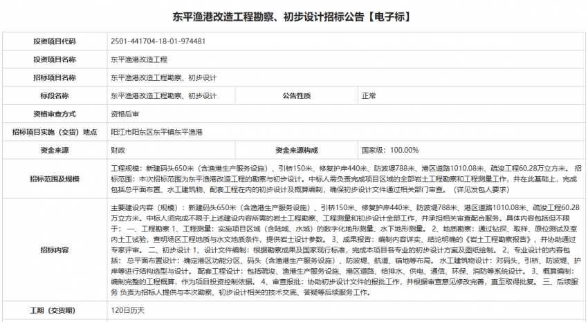 阳东区东平渔港改造工程勘察、初步设计招标公告